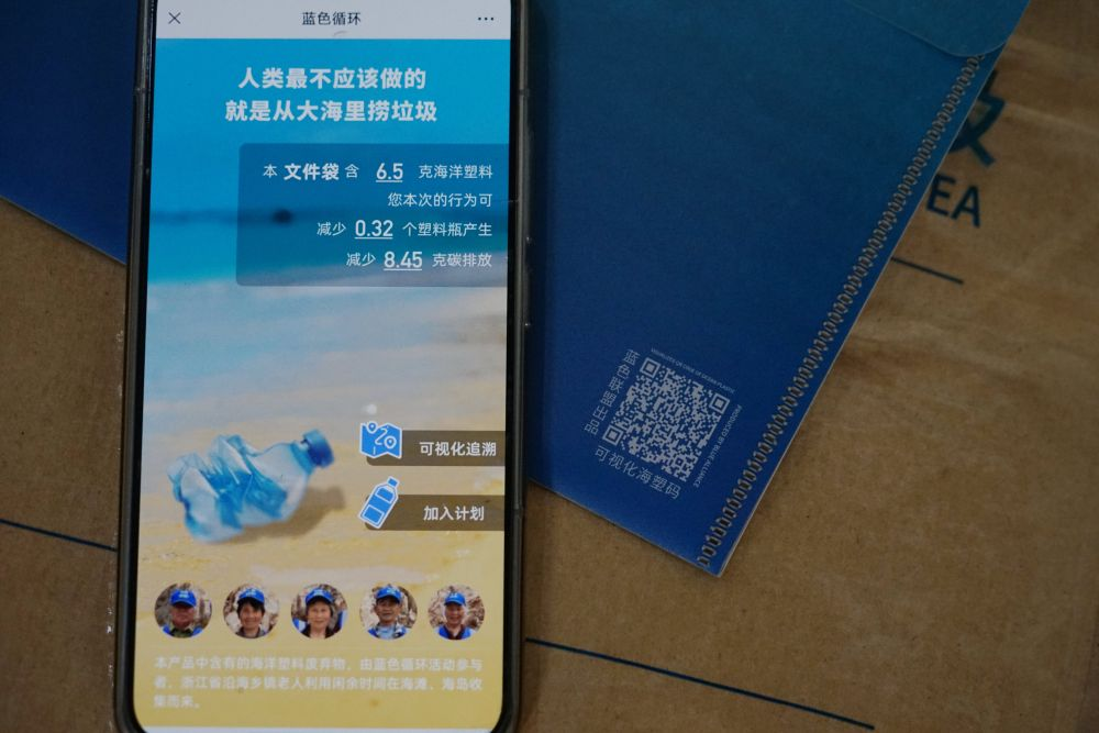 在蓝景科技,记者领到一个用海洋废弃物制作的文件袋。扫描上方的二维码,显示的图片里写着:该文件袋含有6.5克海洋塑料,消费者此次购买行为可减少0.32个塑料瓶产生,减少8.45克碳排放,图片下方配有收集者的头像照片。点击可视化追溯按钮,可以在地图上看到该产品“从海洋到货架”的整个流程。