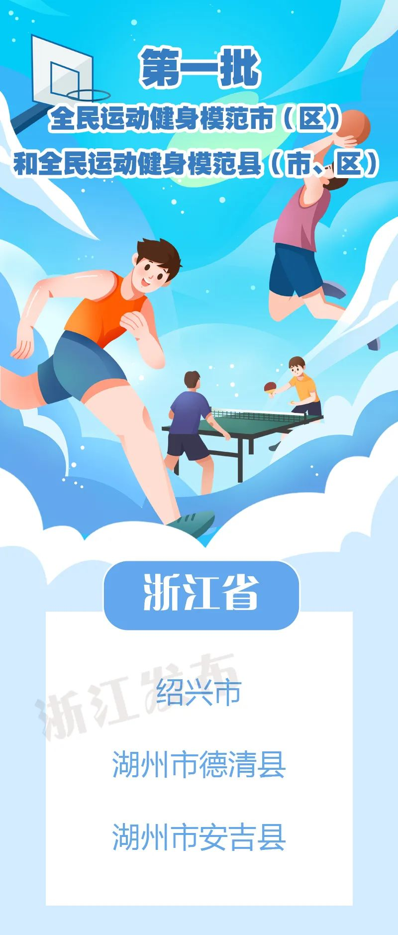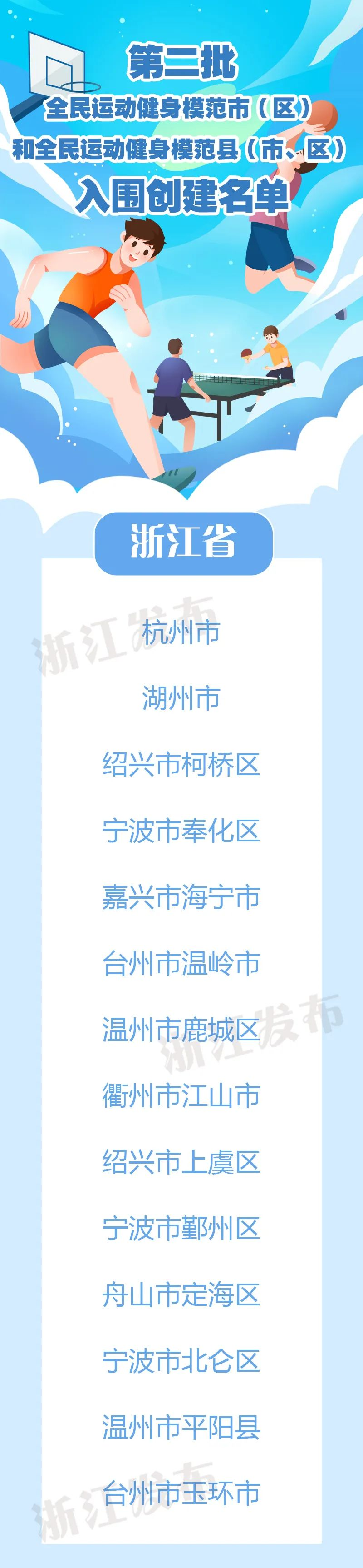 近日,国家体育总局群众体育司发布第二批全民运动健身模范市(区)和全民运动健身模范县(市、区)入围创建名单,浙江2地市、12县(市、区)入选。
