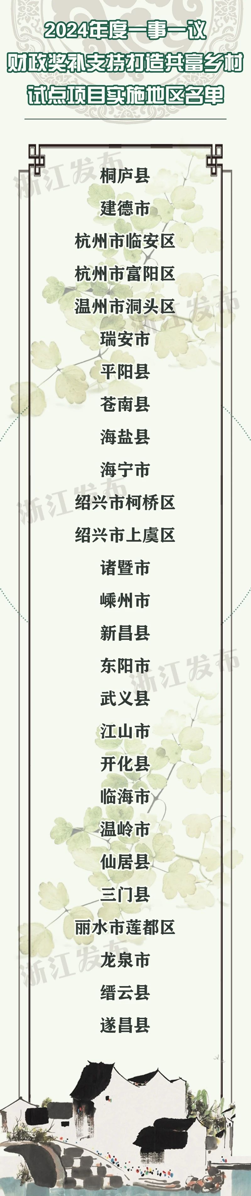 经县级申报、省级评审、名单公示、方案完善等完整流程,省财政厅近日公布2024年度一事一议财政奖补支持打造共富乡村试点项目实施地区名单,共27个县(市、区)项目实施方案入围。
