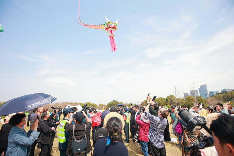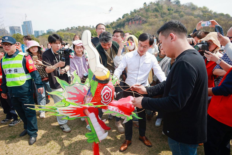 启动仪式上,点睛后的“百米长龙”扶摇上升、直冲云霄,寓意龙腾盛世、生活蒸蒸日上。据悉,这款“巨龙风筝”出自山东省级非遗风筝制作技艺传承人郭洪利。现场还准备了各种大型风筝,各具特色。