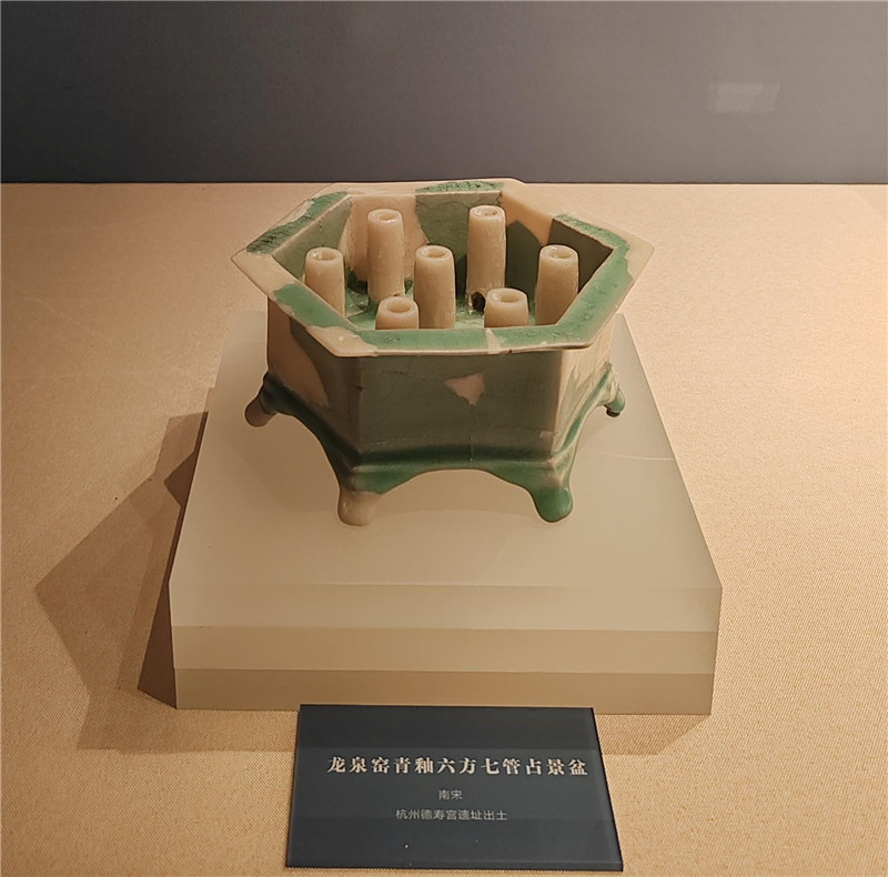 杭州德寿宫遗址出土的龙泉窑青釉六方七管占景盆。新华社记者冯源 摄