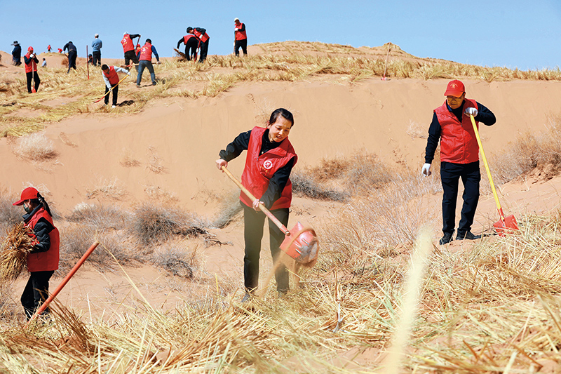 在甘肃省古浪县黄花滩镇五道沟腾格里沙漠南缘,古浪县干部职工和群众在义务压沙(2024年3月19日摄) 郭刚摄/本刊