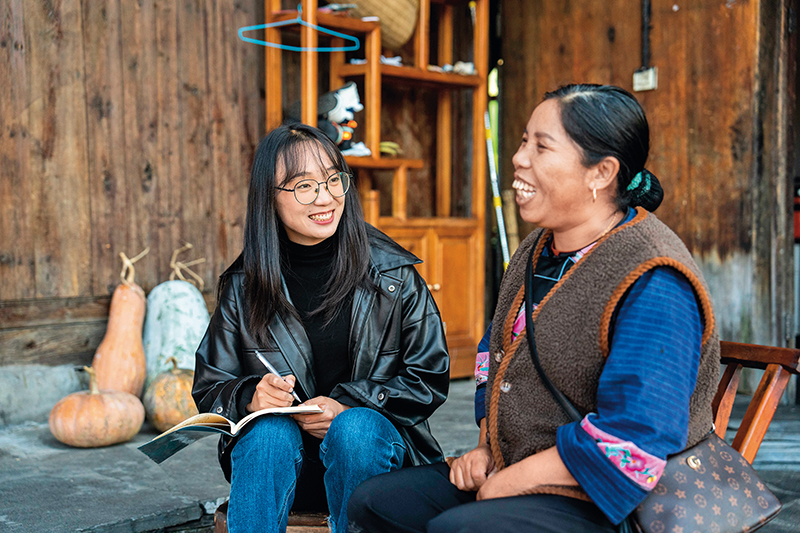 在湖南湘西十八洞村,驻村干部杜霁(左)在走访村民(2023年11月1日摄) 陈思汗摄/本刊