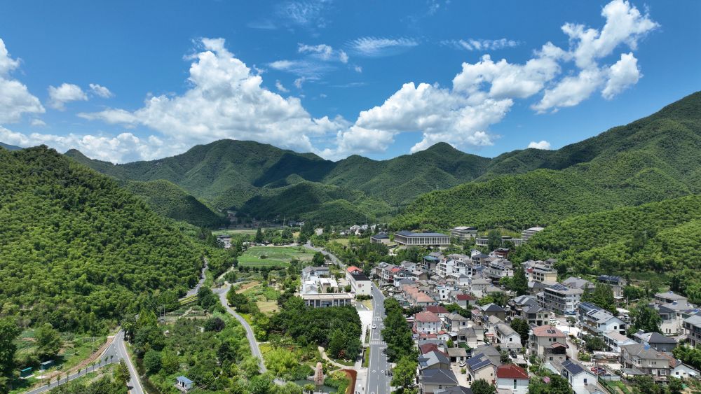 浙江省湖州市安吉县天荒坪镇余村村,村落在绿竹掩映下,构成一幅美丽的生态画卷。(无人机照片)CICPHOTO/潘学康 摄