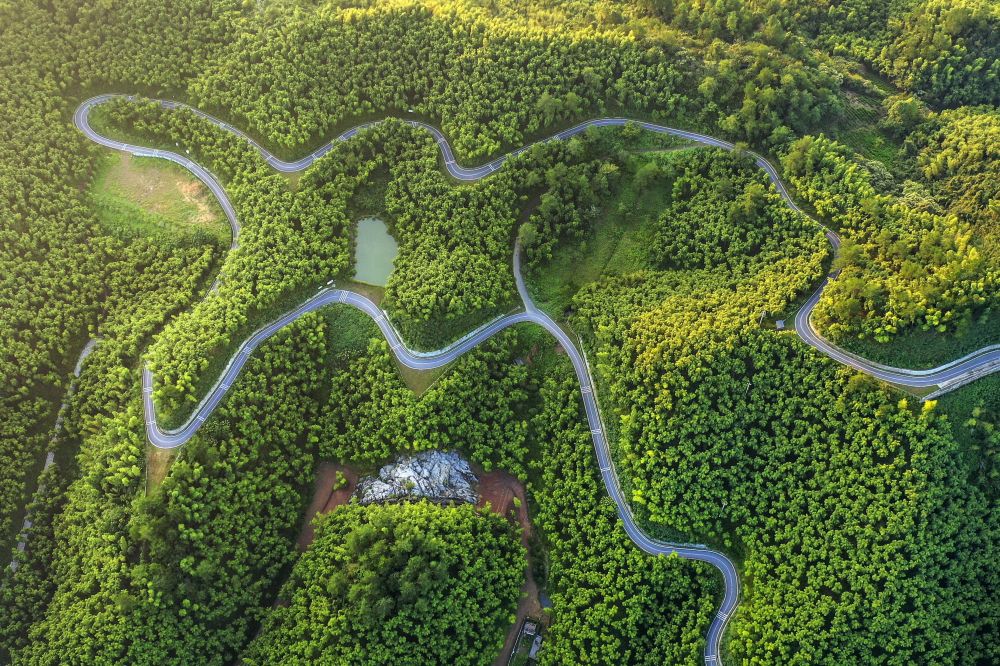 浙江省湖州市安吉县天荒坪镇余村村,竹海间的道路蜿蜒曲折。(无人机照片)CICPHOTO/潘学康 摄