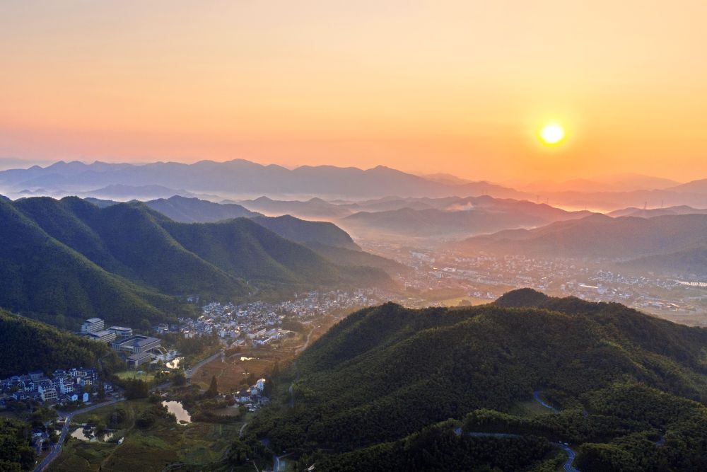 浙江省湖州市安吉县天荒坪镇余村村,被阳光照耀的村庄尽显安宁。(无人机照片)CICPHOTO/潘学康 摄
