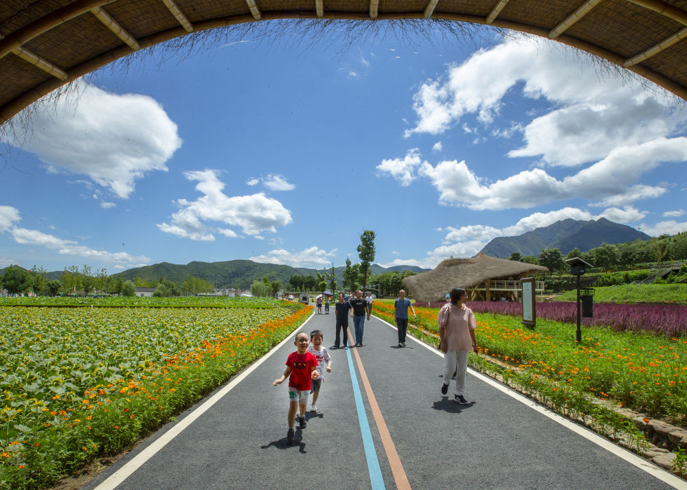 浙江省湖州市安吉县天荒坪镇余村村,游人在街道上漫步。CICPHOTO/夏鹏飞 摄