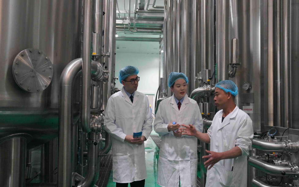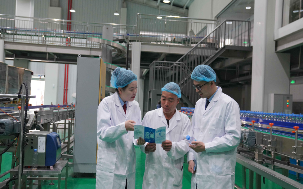 顺水饮料有限公司工作人员向税务干部介绍智能化生产线和水处理工艺。国家税务总局泰顺县税务局供图