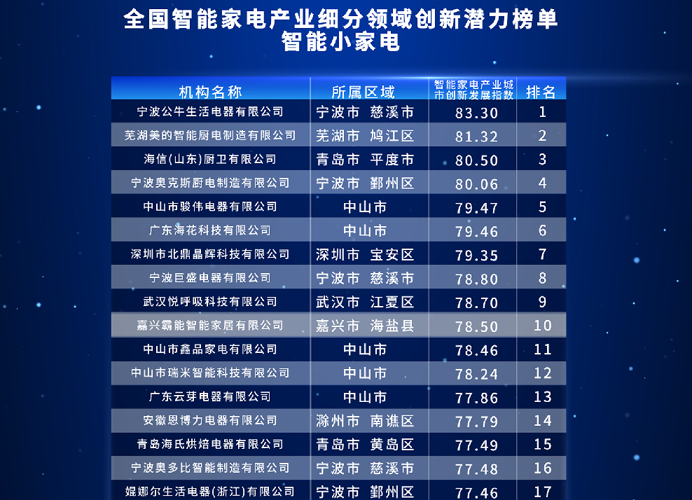 通过“指数”计算及比较排名,形成“全国智能小家电产业城市创新引领榜单”“全国智能小家电产业细分领域创新引领榜单”“全国智能家电产业细分领域创新引领榜单”“全国智能小家电产业细分领域创新潜力榜单”等四份榜单。根据“榜单”显示,慈溪市智能家电产业城市创新指数位居全国工业百强县(市、区)第二。其中,智能小家电产业城市创新发展指数、入围中国智能小家电产业创新引领百强企业数和中国智能小家电产业创新潜力百强企业数等多项指标居全国首位。