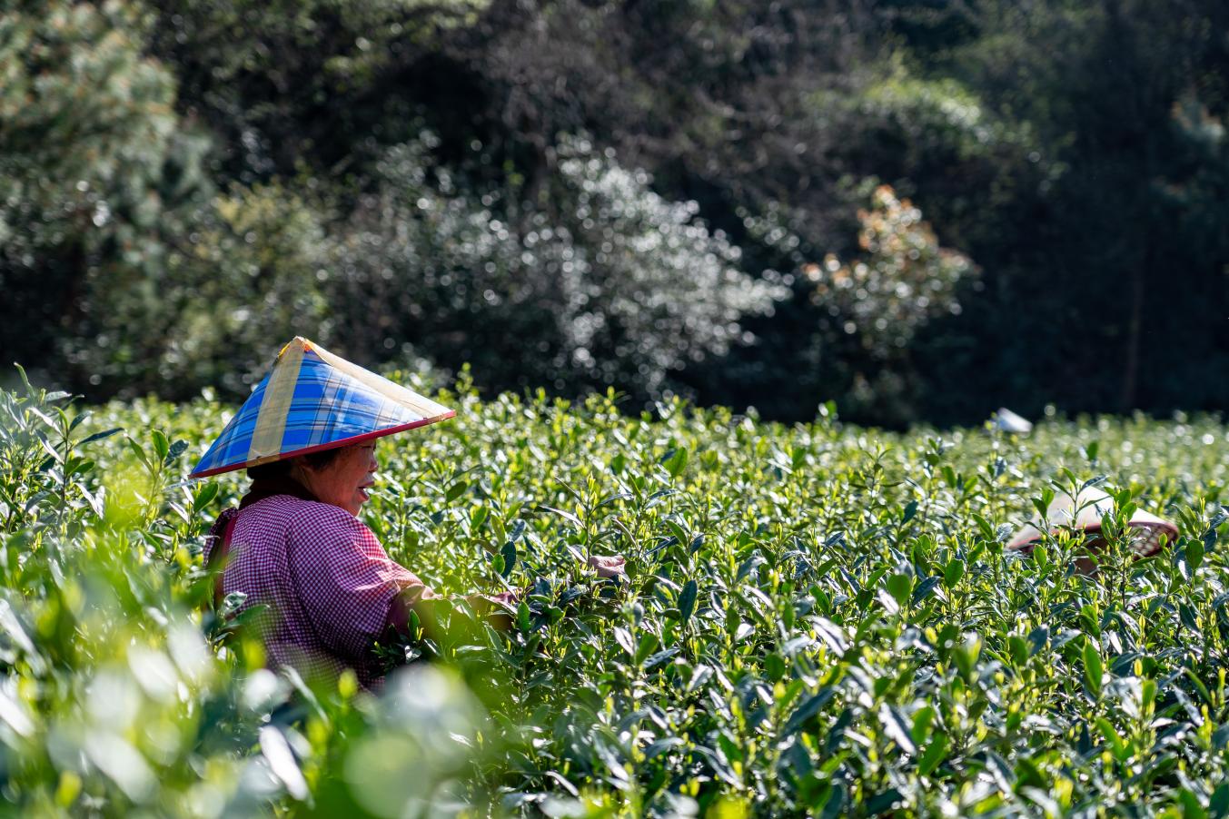 在绍兴御茶村茶业有限公司的茶园上,采茶工们手指在茶树间轻盈穿梭,熟练地采下嫩芽放进腰间的竹篓。“我们第一批是6点开始采茶的,一般摘到晚上4点半左右。”采茶工金阿姨说。目前采茶工采摘的是头茬日铸茶采摘标准都是一芽二叶,一位工人一天能采2—3公斤左右。