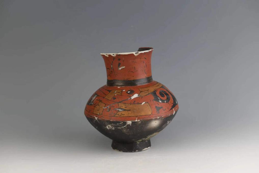 寺墩遗址出土的崧泽文化遗存——一件用红、黄、黑三彩绘制的编织纹卷尾鸟形象陶壶。南京博物院供图