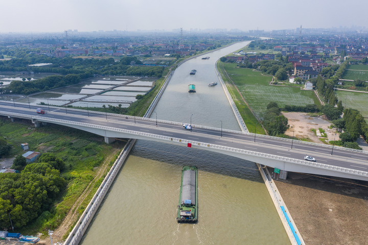 2023年7月18日,首批通航货船进入京杭运河杭州段二通道驶往钱塘江(无人机照片)。新华社记者 徐昱 摄