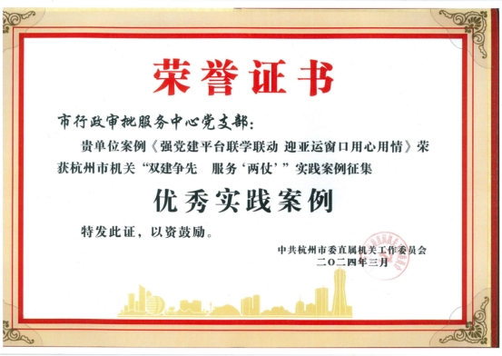 3月,杭州市行政审批服务中心迎来喜讯。中心党支部“强党建平台联学联动 迎亚运窗口用心用情”案例在杭州市机关“双建争先 服务‘两仗’”实践案例征集活动中荣获“优秀实践案例”。