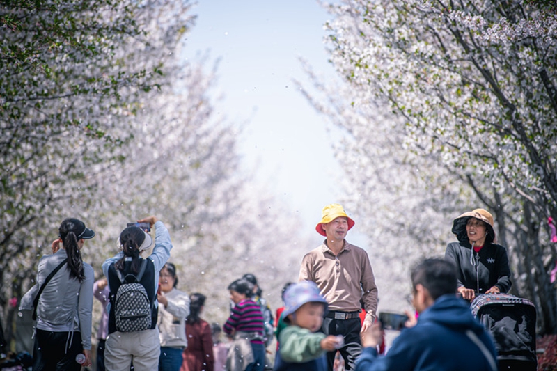 2024年3月29日,市民在杭州市滨江区沿江绿道“樱花跑道”上赏花游玩。新华社记者 江汉 摄