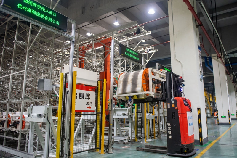 2024年2月23日,无人叉车在杭州市钱塘区中策橡胶集团股份有限公司的未来工厂内运输产品。新华社记者 江汉 摄