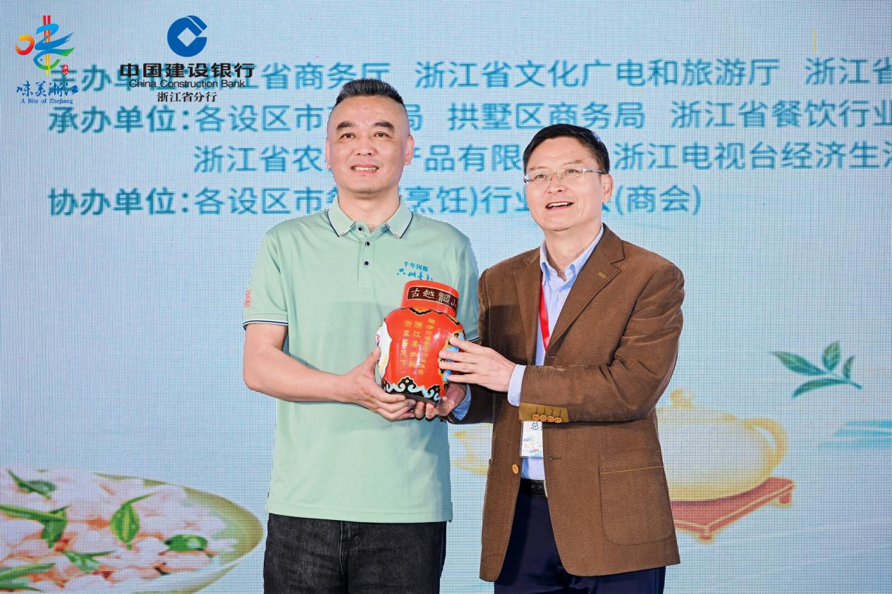 在4月13日举行的比赛期间,浙江省餐饮行业协会会长沈坚授权古越龙山国酿“只此青玉”联名款为本次活动的推荐用酒,彰显了浙菜与浙酒文化的结合。