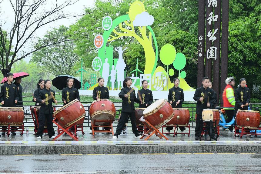 乐清市城南中学学生民族鼓打击乐团为选手加油助威。乐清市委宣传部供图