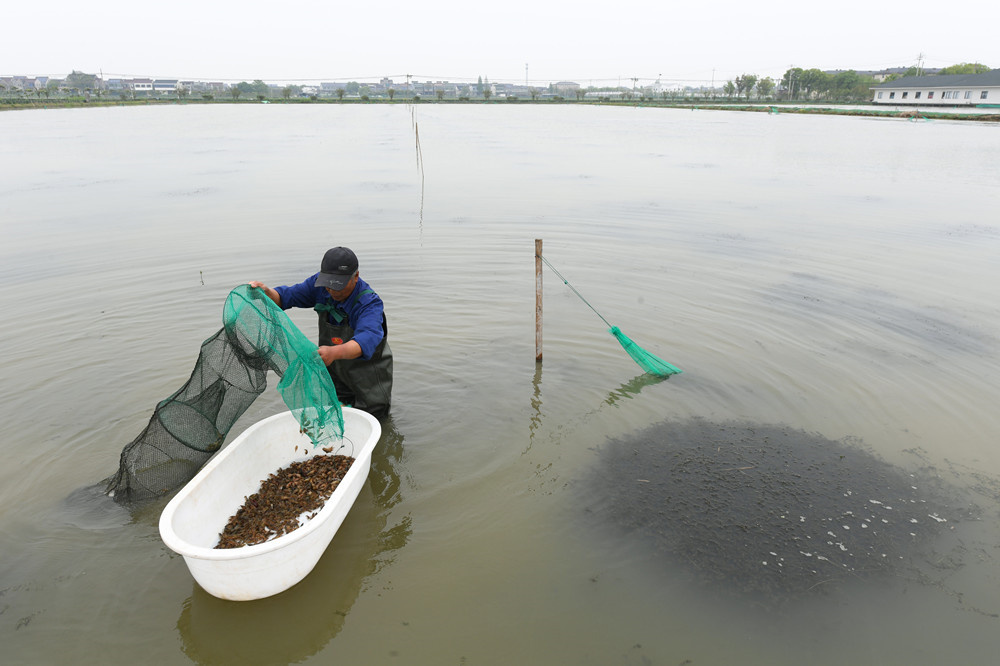 4月11日,浙江湖州许溇村村民在虾塘捕捞小龙虾苗,成熟的小龙虾将于5月集中上市。许溇村近年来通过发展枇杷种植和小龙虾养殖打响水乡游品牌,为村民增收。