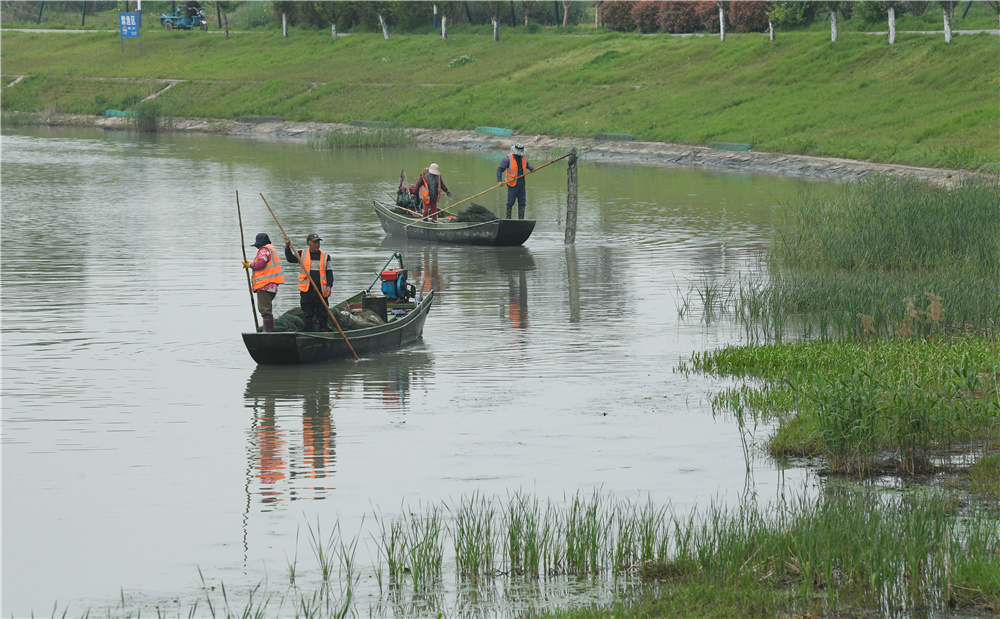 4月11日,河道保洁员在位于浙江湖州的太湖罗溇港沿岸清理非法捕鱼地笼网(无人机照片)。太湖溇港是具有两千多年历史的世界灌溉工程遗产,近年来政府通过对太湖溇港持续拓宽、疏浚和治理,使太湖主要入湖口断面水质连续多年保持在Ⅲ类及以上水平。