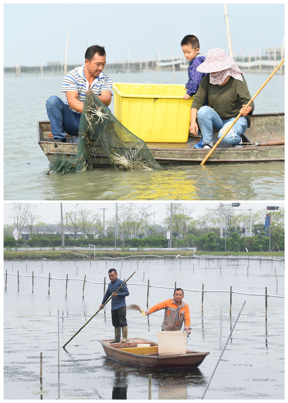 这是一张拼版照片。上图:浙江湖州庙港人水产有限公司的员工张海发在位于太湖上的养殖基地捕捞大闸蟹(2018年10月17日摄)。下图:张海发在位于杨溇村的蟹塘内给幼蟹喂食(2024年4月11日摄)。2018年起环太湖区域开始实行“退蟹还湖”,庙港人水产有限公司将原先在太湖上的养殖基地关闭,迁到太湖南岸的杨溇村挖蟹塘引太湖水进行养殖。