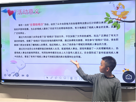 活动伊始,小主持人以清脆的嗓音和自信的姿态,向同学们介绍了全国助残日的由来和意义,引发了大家对残障人士生活状态的关注。紧接着,通过一段精心准备的短片,同学们了解了残障人士在日常生活中所面临的种种困难,不少同学纷纷表示要为他们提供更多的帮助和关爱。