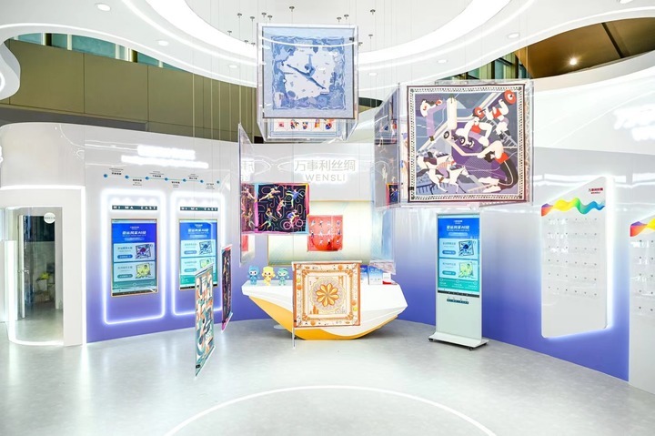 图为杭州亚运会主媒体中心,万事利设立的AI丝巾定制体验区。(图片由采访对象提供)
