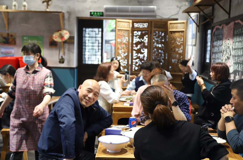 胜利饭店沿河而建,整体风格宛如余华小说中一般,充满时代味。店内真实还原了余华小说《许三观卖血记》中的场景,重现上世纪六七十年代的饮食风貌。“五一长假未至,店里已经忙得热火朝天,只要一开门就有顾客涌进来。”胜利饭店负责人沈明根介绍。