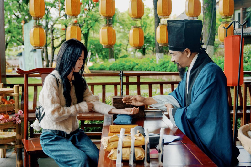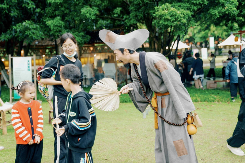 走进九山书会,沉浸式国风美学扑面而来,游走其中,不时还能碰到坐诊的“李时珍”,在园区内“晃荡”的“济公”,忙着发“灵丹妙药”的“蔡文姬”……找他们“问诊”的游客,还能得到一份趣味药方。