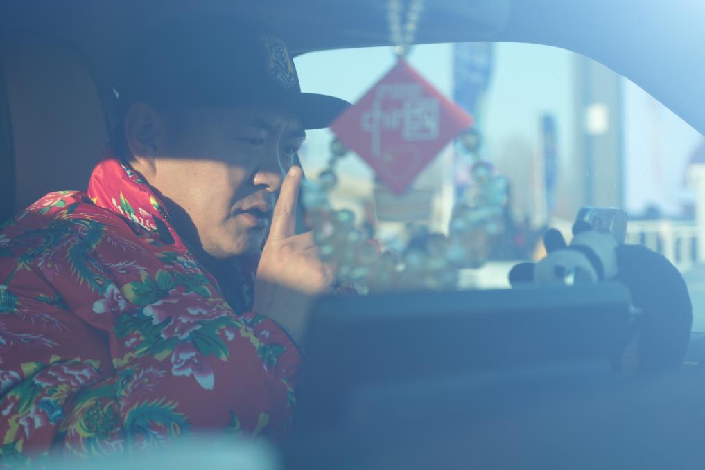“左右哥”在车内接受视频连线采访(2024年1月9日摄)。新华社记者 张启明 摄