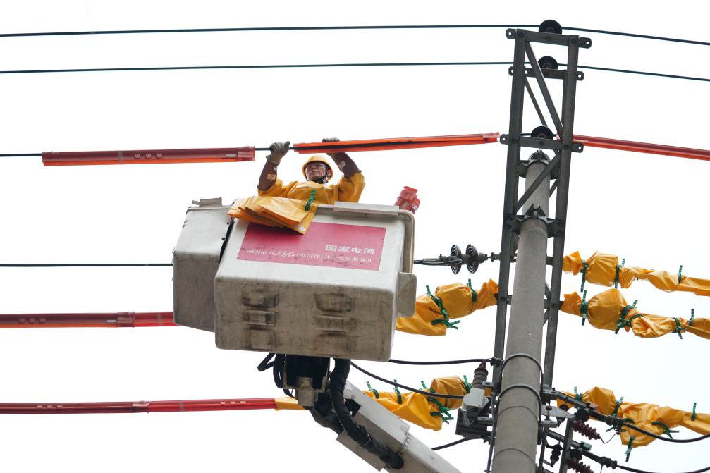4月24日,贺彪在湖南省长沙市岳麓区一小区开展带电作业。新华社记者 薛宇舸 摄