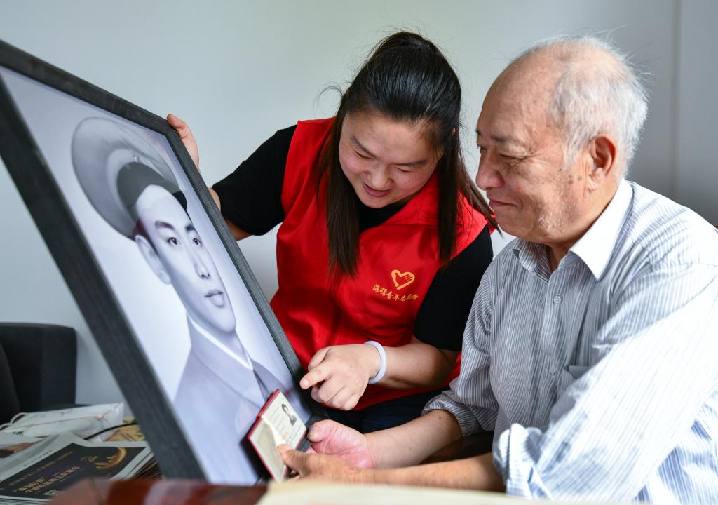 孙嘉怿给烈士后代送去志愿者修复的烈士遗像。(丁继敏 摄)