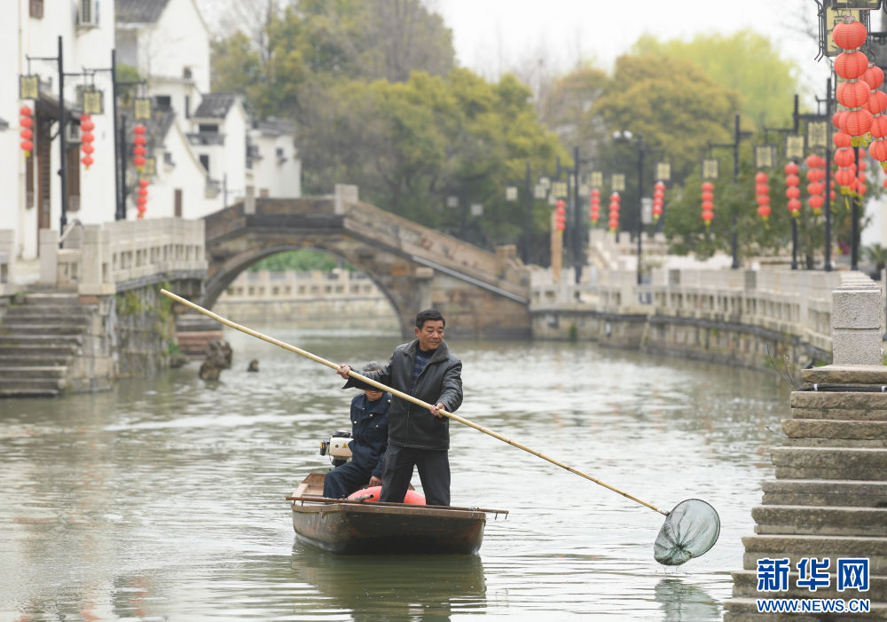 2023年3月16日,在太湖畔的浙江省湖州市织里镇义皋村,保洁员在清理河道。多年来的溇港整治使得太湖周边河道水质明显改善,也为乡村旅游注入动力。新华社记者 翁忻旸 摄