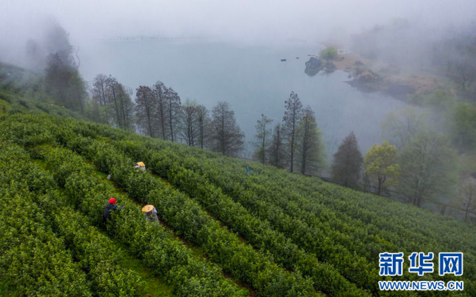 2024年4月7日,在位于浙江省金华市金华山鹿田村的婺州举岩茶基地,茶农在采摘举岩茶鲜叶,发展特色茶产业是推动当地百姓共富的重要途径之一(无人机照片)。新华社记者 徐昱 摄
