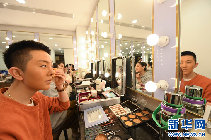 2024年5月1日,参演新编现代戏《钱塘里》的演员在杭州蝴蝶剧场的化妆间上妆。新华社记者 翁忻旸 摄