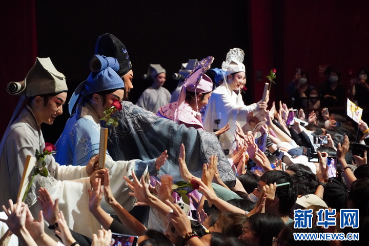 在杭州蝴蝶剧场,浙江小百花越剧院的演员在新版《梁祝》(青春版)演出后和观众互动(2023年10月25日摄)。新华社发(百越文化创意有限公司供图)