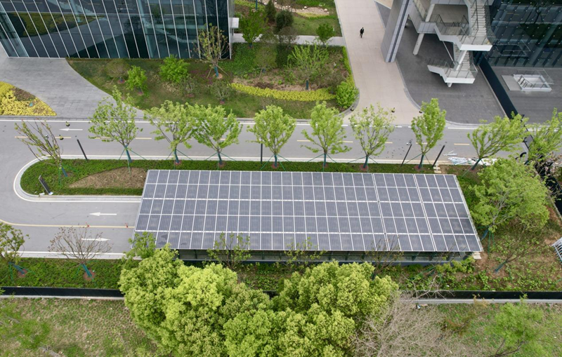 分布式光伏发电项目采用“自发自用、余电上网”模式,发电、充电、停车一体工程,分3个并网点实现380V低压并网,总装机量为325.275kWp,采用733块光伏组件,有效光照下,年平均发电量可达32.845万度电,相当于2000棵树每年吸收的二氧化碳排放量,实现了空闲资源的最大化利用。
