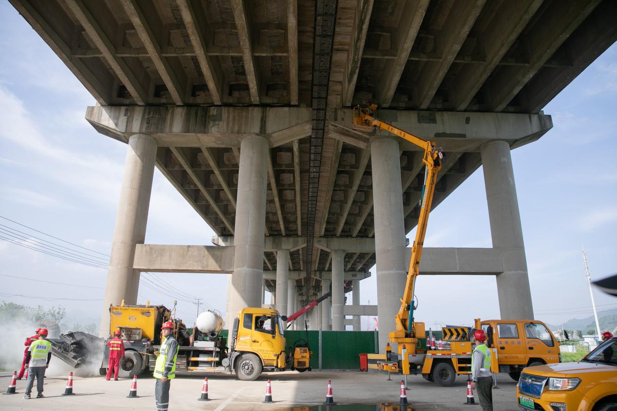 “台风登陆”后,造成市区多数道路出现不同程度积水。抢险队紧急出动,启用“龙吸水”排涝泵车强排作业,积水很快消退;“台风”造成温州七都大桥路面出现多处坑洞,一个墩柱被过往车辆撞击后疑似受损。抢险队员快速到达现场,排查险情,修复道路,不到半小时,桥梁恢复基本通行;“暴风雨”中,市区七都街道沙洲路发生道路照明设施故障,影响抢险车辆通行。抢险队快速处置,扑灭配电箱火,解除故障恢复照明;“暴雨”后,某主干道路仍积水严重,疑似管道堵塞,经冲洗清通,路面积水全部清除。
