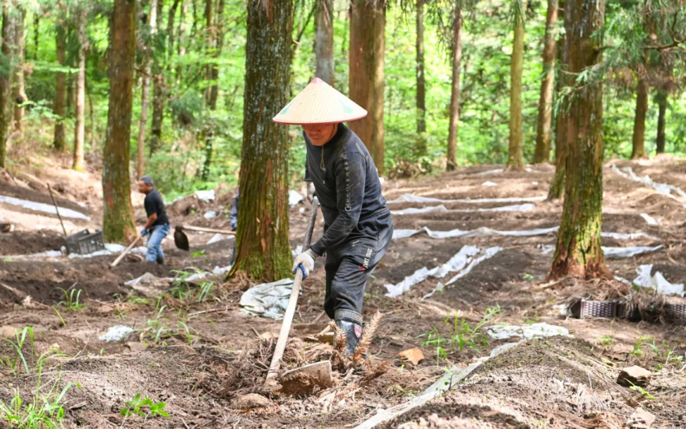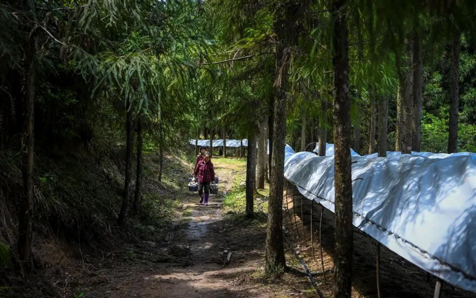 在石垟林场的竹荪基地,成片的树林下都种着竹荪,工人正给红托竹荪覆土。土壤之下,白嫩的菌丝正茁壮生长。