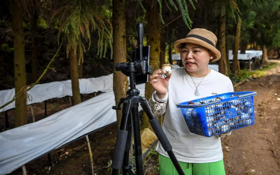 在另一边,主播赵燕燕把直播机位架在林间,手捧赤松茸向网友介绍。赵燕燕表示,通过直播电商他们将赤松茸销往全国各地,同时还参加了杭州的农产展销会,对接了广州、上海等较大型的菌菇类市场,多种渠道进行销售。