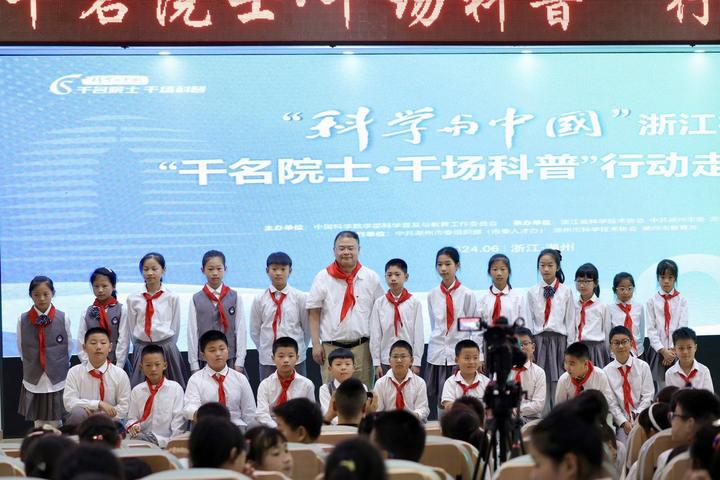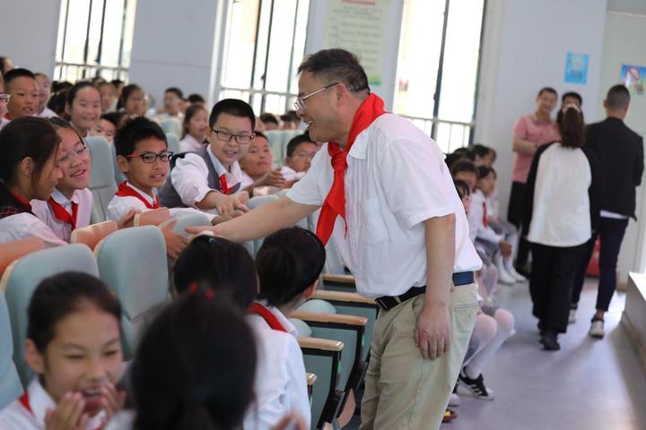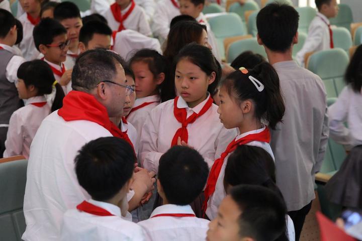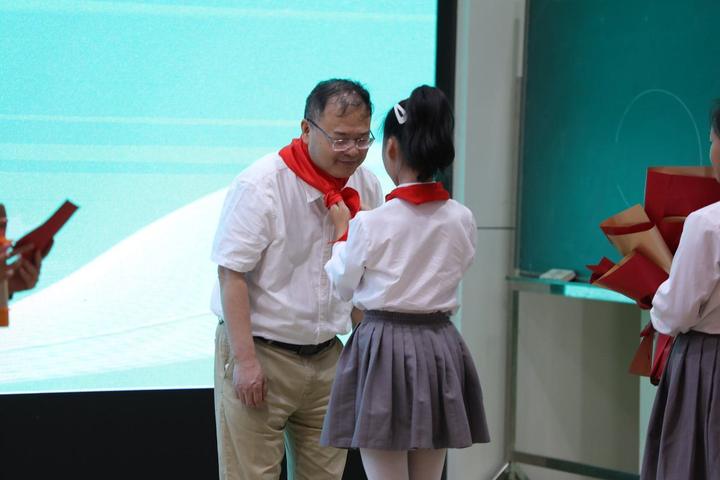 来到报告厅,等待已久的孩子们全体起立欢迎这位科学家的到来,现场掌声雷动。紧接着,学生代表为他献上了红领巾与鲜花。