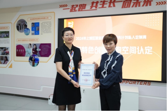 活动中,杭州市上城区人力资源和社会保障局相关负责人为上城(凯旋)创业陪跑空间颁发青年特色创业陪跑空间认定证书。