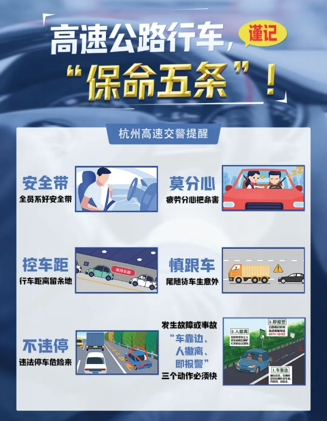 端午小长假即将开始,高速公路车流量大幅增加,潜在风险和隐患也随之上升,在此杭州公安高速交警提醒广大司乘人员,请注意以下几点: