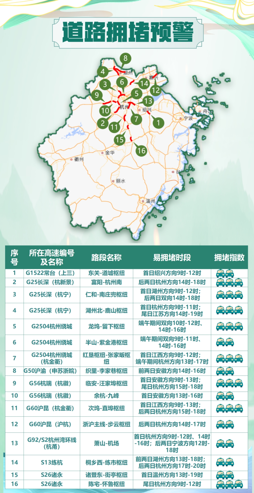 端午节假期马上到啦,今年端午节假期与省内高考时间相重叠,道路通行流量变化复杂。如有出行计划,记得提前规划好线路和时间哦。