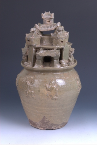 隋唐至北宋时期,会稽郡变越州。唐到北宋,是越窑的全盛时代,唐代陆龟蒙曾在《秘色越器》中提到的“九秋风露越窑开,夺得千峰翠色来”,成为描写越窑青瓷的名句。堆塑罐是越窑青瓷中的精品,于绍兴越城区鉴湖镇南池村西晋墓出土。今绍兴上虞上浦、章镇一带古窑址密布,且考古调查显示,在上虞凤凰山麓三国、西晋窑址中确有此类器物残片。