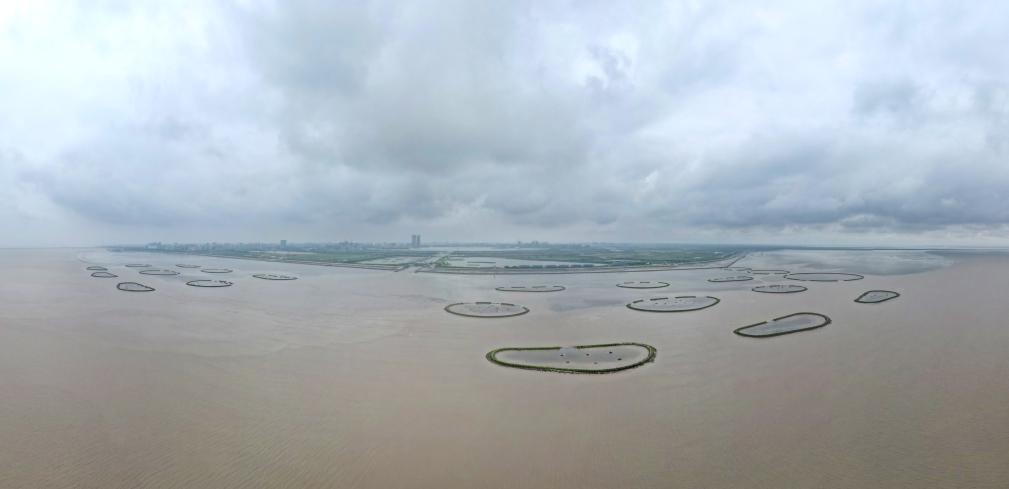 俯瞰上海临港新片区滨海区域,一个个形状如同开口贝壳的大型牡蛎礁在潮涨潮落中隐现,各类海鸟不时飞过,滩涂上生长着茂密的芦苇,海三棱藨草等本地植物也随处可见。