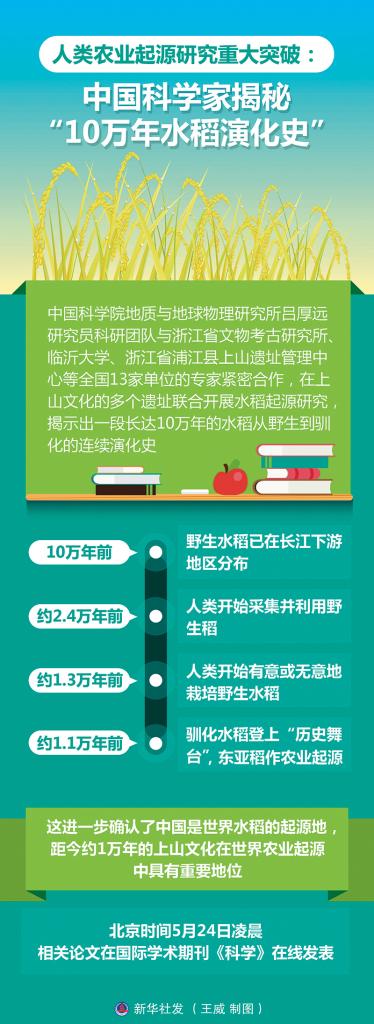5月24日,论文《东亚水稻从野生到驯化的轨迹》在权威国际学术期刊刊发,中国学术界向世人揭示了一个重大而有趣的事实:人类吃大米,至少有2.4万年的历史,东亚栽培水稻与西亚栽培小麦、中南美栽培玉米的起源时间同步。