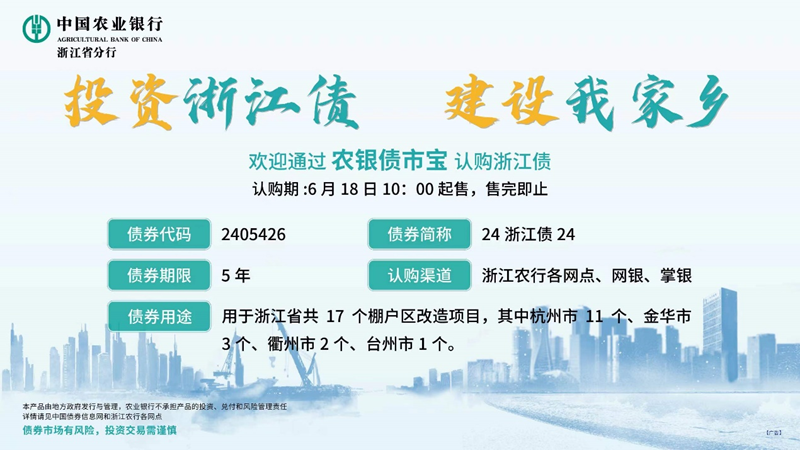6月18日,浙江省政府将通过商业银行柜台市场面向个人和中小机构发行面值不超过18亿元的政府债券。经前期各家银行申请、省财政厅评估,农业银行浙江省分行成为浙江省政府债券柜台发行承办银行之一。投资者可以通过柜台、网银、掌银渠道购买农行代销的浙江省政府债券。