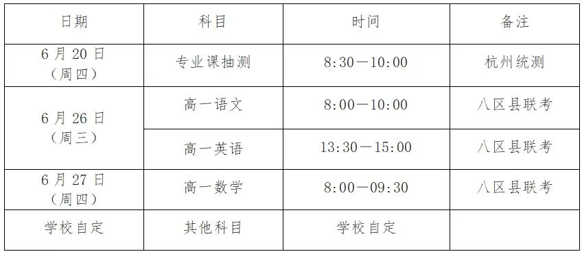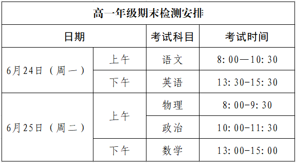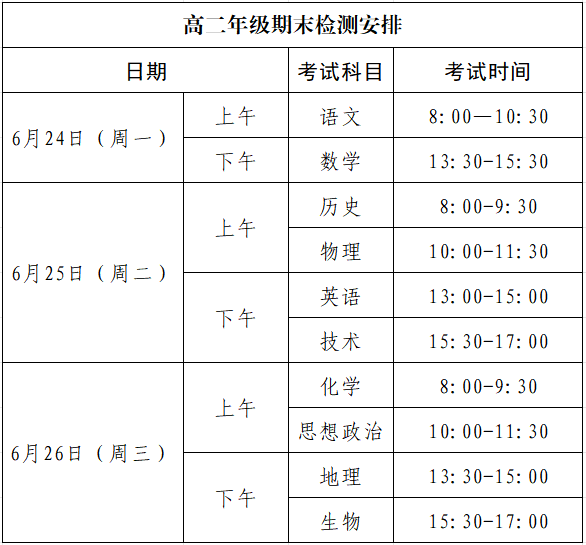 普通高中6月26日—28日期末考试,7月1日—2日学考,高一7月4日学期结束,高二7月10日学期结束。