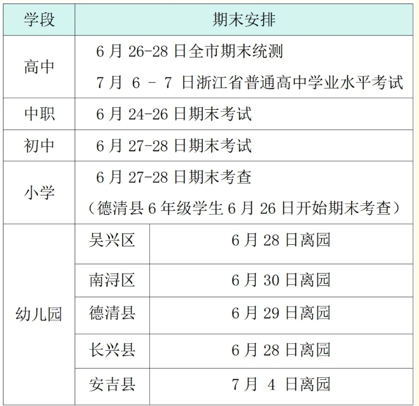 小学、初中6月29日—7月1日,中职学校6月28日—30日期末考试,部分年级质量监测时间由教育学院安排,7月4日学期结束,7月5日暑假开始,幼儿园参照执行。