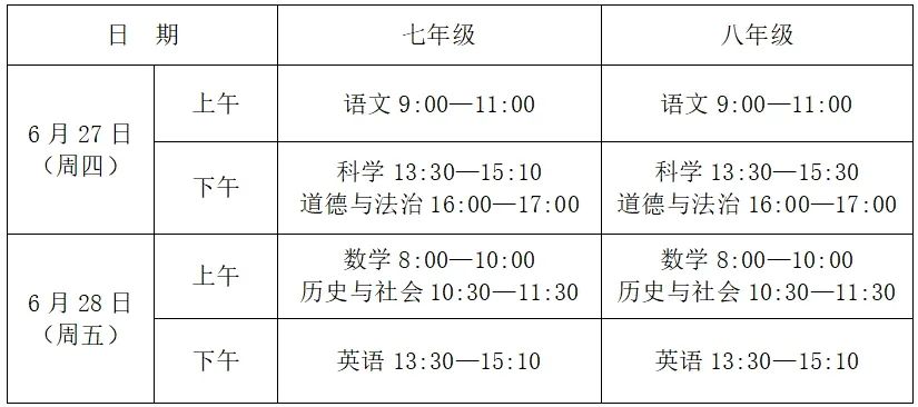 期末考试时间安排:小学、初中期末考试时间为6月26日至28日,幼儿园和中职学校参照执行,7月1日起放暑假。普通高中期末考试时间为6月30日至7月2日,学考时间为7月6日至7日,7月8日起放暑假。